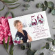 Elégante feminine 50 et fabuleuse photo de fête d'anniversaire et nom invitation personnalisée avec aquarelle rouge bordeaux, bouquets rose bleu poussiéreux, et un script de typographie moderne tendance.