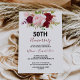 Cette invitation d'anniversaire de mariage de 50 ans tropical et romantique rouge est parfaite pour une fête d'anniversaire rouge. Le design artistique bordo marsala présente des roses en aquarelle, vertes, roses, bordeaux et blush assorties de verdure soigneusement disposées dans un bouquet de fleurs gracieux et radieux.