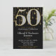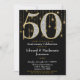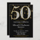 Une élégante invitation de fête de 50e anniversaire en noir et or, avec un grand 50 avec des diamants et une apparence dorée ainsi qu'un rideau scintillant de lumières dorées.