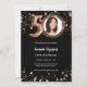 Une invitation photo moderne et design pour une fête du 50e anniversaire. Un arrière - plan noir, un texte rose en or. Décoré d'étoiles dorées roses. Personnalisez et ajoutez les détails de votre fête.