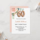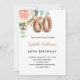 Une élégante invitation pour une fête de 60e anniversaire. Un arrière - plan blanc chic. Décoré d'or rose et de rose pastel rose vif, de fleurs roses, de feuilles d'eucalyptus verts, de sprigs, de verdure et de faux sprigs d'or. Personnalisez et le nom et les détails du parti. Lettres noires et dorées. Le nom est écrit avec un script de style moderne écrit à la main. Le numéro 60 est écrit avec une police de style ballon doré. Dos : or rose couleur arrière - plan.
