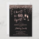Invitation du 60e anniversaire. Salutations À 60 Ans ! Design élégant en or noir et rose. Il comprend des verres à champagne, des caractères de script et des confettis. Idéal pour une soirée de soixantième anniversaire. Personnalisez avec vos propres détails. Peut être customisé pour montrer n'importe quel âge.