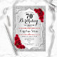 Invitation du 70e anniversaire. Design floral élégant en argent et rouge. Comprend des bandes d'argent faux parties scintillant, des roses rouges police de caractères stylisés et des confettis. Parfait pour une fête d'anniversaire glam.