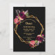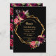 Devant : Une invitation pour une fête de 70e anniversaire. Un arrière - plan noir chic avec un cadre géométrique en faux or. Décorée de fleurs bordeaux foncé et roses, de plumes roses et boho. Modèles pour un nom et les détails de la fête. Le nom est écrit avec un script de style écrit à la main, des lettres de couleur dorée. Retour : arrière - plan noir et grand roses luxuriants en bordeaux et violet.