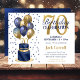 Ce fabuleux gâteau bleu marine de 70e anniversaire masculin invitation à la fête surprise avec un gâteau bleu marine 2 couches et or avec ballons bleu marine et or et le numéro 70 en or serait parfait pour célébrer votre mari, frère, père, ami, oncle, grand-père, arrière-grand-père. Traditionnel et classique, il est frais, moderne et contemporain. L'arrière est une feuille bleu marine de coordination.