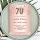 Une invitation moderne, élégante et glamour pour une fête de 70e anniversaire. Un arrière - plan d'or rose avec de l'or rose et des étoiles à gouttes roses.Le nom est écrit avec un script de style manuscrit moderne de couleur rose doré foncé. Personnalisez et ajoutez les détails de votre fête. Le numéro 70 est écrit avec une police de style ballon, script.