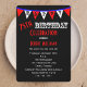 Cette amusante invitation à la fête de 75e anniversaire présente le mot HAPPY le long du sommet en drapeaux rouges et blancs sur un fond noir. La célébration du 75e anniversaire apparaît sous les drapeaux, tout comme vos importants détails invitations de fête du 75e anniversaire. Il s'agit d'un invitation de drapeau de typographie moderne pour une célébration de 75ème anniversaire. Copyright henishouseo