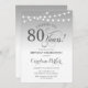 80th Birthday Invitation Design blanc argenté élégant avec des lumières à cordes de fées et une police de script. Bravo à 80 ans ! Peut être personnalisé à tout âge! Message-moi si vous avez besoin d'une personnalisation plus poussée.