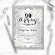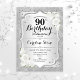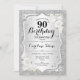 90e Invitation d'anniversaire. Design élégant en argent et blanc. Comprend des bandes d'argent faux parties scintillant, des roses blanches police de script et confetti. Parfait pour une fête d'anniversaire glam.