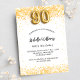 Pour une soirée élégante de 90ème anniversaire. Un arrière - plan blanc chic. Décoré de parties scintillant en faux or, brille. Personnalisez et ajoutez un nom, un âge et des détails de la fête. Le nom est écrit avec un script de style écrit à la main. Numéro 90 avec police de style ballon.
