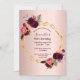 Devant : Une invitation pour une fête de 90ème anniversaire. Un élégant et tendance rose d'or faux métallique à l'aspect arrière - plan avec un cadre géométrique en faux or. Décoré de fleurs violettes foncées et bordeaux, de plumes roses et boho. Modèles pour un nom et les détails de la fête. Le nom est écrit avec un script de style écrit à la main, des lettres de couleur violette. Retour : rose or faux métallique à l'arrière - plan