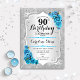 90e Invitation d'anniversaire. Design élégant en argent et bleu glacé. Comprend des bandes d'argent faux parties scintillant, des polices de caractères et des confettis stylisés turquoise rose. Parfait pour une fête d'anniversaire glam.