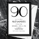 Celebrate in timeless elegance with this black and white 90th birthday invitation, designed for him or her. The front features a bold “90” in stylish black lettering against a sleek white background, with modern typography for the event details. The back is finished with simple black and white stripes for a touch of glam. Perfect for milestone celebrations, whether it's a chic dinner party, cocktail evening, or upscale gathering. Fully customizable for any name and party info. Ideal for adult birthday invitations, 90th birthday party invites, and gender-neutral milestone event stationery.