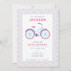 Célébrez un anniversaire avec cette invitation amusante et moderne avec un vélo. Avec ses couleurs rouge, bleu et violet, cette invitation est parfaite pour les fêtes du printemps et de l'été. Une partie d'une collection de Parcel Studios. Décor de la fête de coordination disponible.