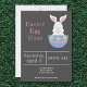 Une invitation personnalisable pour une chasse aux oeufs de Pâques avec l'illustration d'un lapin aux oreilles roses sortant d'un oeuf de Pâques bleu décoré de fleurs ! Un poussin jaune est imprimé sur le dos ! Il sera plus facile d'envoyer les invitations à votre chasse aux oeufs de Pâques.