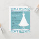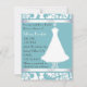 Jolie invitation à la douche nuptiale faite en aquamarine et blanc, avec une belle robe mariage sur un stand de décoration. Customisez le texte en fonction des besoins de votre parti.