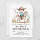 Personnalisez votre propre invitation à la fête d'anniversaire sur le thème des cowboys avec ce design charmant. L'invitation présente une illustration détaillée d'un jeune cowboy à cheval, dressé contre un arrière - plan blanc.