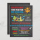 Chalkboard Birthday Pool Party Invitation Le soleil est chaud, l'eau est cool, il est temps de sauter dans la piscine! Préparez-vous pour l'été avec l'invitation festive et colorée Pool Party! Dispose du mot "Pool" fait de jouets de piscine, des éclaboussures d'eau et des polices de craie amusantes, un soleil heureux avec des lunettes de soleil sur un arrière - plan de tableau noir. Idéal pour une fête d'anniversaire de fille ou de garçon. Illustration tirée à la main par McBooboo.