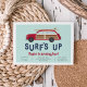 Les jolies invitations d'anniversaire d'été pour votre petit bain de plage surfer disposent d'une voiture vintage en bois rouge cerise, avec une planche de surf sur le dessus. "Surf up" apparaît dans les lettres rétro, avec les détails de votre fête d'anniversaire en dessous.