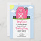 Une invitation à la fête d'anniversaire illustrant une grange rose avec silo et clôture noire de chaque côté. Personnalisez le texte rose et noir avec les détails de votre occasion.
