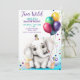 Le mignon éléphant en Casquette de fête avec ballons, corne et Confetti célèbre un anniversaire.