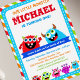 Célébrez votre anniversaire avec notre Invitation à la fête du Monster Bash. cette invitation à la fête d'anniversaire de monster inc présente 2 mignons monstres sur des bandes colorées arrière - plan. Parfait pour votre petite fête de premier anniversaire monstre, votre gabba gabba thème d'anniversaire, gâteau smash fête de premier anniversaire ou fête d'anniversaire monster université.