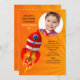 Invitation juvénile avec une fusée rouge au décollage. Le arrière - plan est doté de rayons dorés et d'une baie vitrée ronde. Adapté à l'un ou l'autre sexe.La carte est facile à customiser avec votre libellé, police, couleur de police et choix de six types de papier.