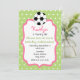 Une invitation pour une fille à la fête d'anniversaire sur le thème du football. Les Arrière - plans des deux côtés sont verts avec des pois blancs. La façade est recouverte d'un cadre rose rempli de blanc et d'un ballon de football au sommet. Personnalisez le texte rose, vert et gris pâle avec les détails de votre occasion.