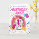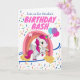 Invitation à une fête d'anniversaire sur le thème de la licorne avec une licorne arc-en-ciel, des ballons d'anniversaire et des confettis. Ajoutez un nom à la couverture. Ajoutez vos informations de fête à l'intérieur. Art, image et verset copyright © Shoaff Ballanger Studios, 2022.