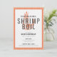 Carton d'invitation à une fête de cuisson de crevettes avec une illustration de crevette et un motif à carreaux. Cette invitation serait parfaite pour une gamme d'occasions, y compris les dîners de répétition, les fêtes de remise de diplômes, les célébrations d'anniversaire et les anniversaires de mariage.