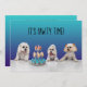 Il est temps que nos adorables furbys pawty. Dégustez votre chien amoureux de fourmis et de pawmily avec cette invitation amusante. Arrière - plan à dégradé bleu et violet avec trois pups espiègles regardant un carrousel de cupcakes, et graphique "It's Pawty Time!" sur le devant. Sur le dos, le même arrière - plan dégradé bleu et violet avec des détails personnalisables pour votre propre pawty. Sont incluses les options pour "Le meilleur garçon" ou "La meilleure fille" et "Un Barkday très spécial" ou "Une journée de Gotcha très spéciale". Il suffit d'activer les icônes "eye" pour voir les options supplémentaires.
