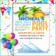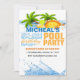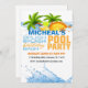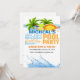 Préparez-vous pour un bain d'anniversaire amusant et tropical! cette invitation à la fête de la piscine comprend de l'eau rafraîchissante, des palmiers et des boissons tropicales.