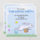 Illustration numérique originale d'un lapin blanc doux et souriant se précipitant pour livrer un panier d'oeufs colorés pour une Pâques heureuse.