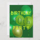 Invitation de fête d'anniversaire verte pour adulte mâle ou femelle. De gros ballons dans les tons verts décorent les deux côtés de ces cartes plates. Texte audacieux sur le front pour annoncer une fête, avec une place pour son âge. Parfait pour un événement marquant en mars, ou pour célébrer un Irlandais.