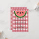 Ce design présente un motif de nappe rouge à damiers et une tranche de pastèque. Pour modifier le style, la taille ou la couleur de la police, cliquez sur le bouton Customiser. Une invitation carré est également disponible pour ce design.