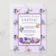 Cet invitation à thé de Pâques propose du lapin blanc d'Alice, un plateau à thé et un arrangement floral sur des tasses à thé akimbo arrière - plan. Reverse a un lapin plus grand, le tout sur le thème de couleur violet.