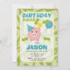 On ne peut pas se tromper avec un peu de vert pour un anniversaire ! Cette invitation présente une tirelire mignonne avec un chapeau de fête et un ballon, agrémentée de billets et de pièces.