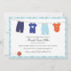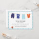 Ces adorables invitations à la douche pour bébés sont accompagnées des vêtements de bébé les plus mignons, accrochés le long d'un étendoir.
