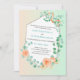 Ce faire-part de mariage insolite, fantasque et joliment décalé présente des fleurs douces d'aquarelle de pêche et des feuilles d'eucalyptus vert menthe. Le libellé est prévu pour la célébration d'une messe nuptiale catholique. L'invitation tout-en-un contient des informations sur la réception et le registre des cadeaux à l'arrière.