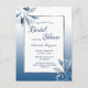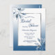 Sur le devant : Un classique bleu et blanc dégradé foncé arrière - plan avec un faux cadre argenté. Décoré de branches botaniques, de fleurs dans les tons bleus. Modèles pour le nom de la mariée et les détails du parti. Le nom et le texte : Fête des mariées sont écrits avec un script de style écrit à la main, des lettres de couleur bleue. Dos : dégradé bleu classique. Conseil : Si vous ne voulez pas qu'il ressemble à une carte postale, cliquez sur customiser, allez à l'arrière et retirez le séparateur et le timbre postal.