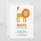 Invitation à la première fête d'anniversaire de lion fantaisiste et adorable. Le dos présente un motif coordonné. Personnalisez le texte pour votre célébration. Œuvre originale de Nic Squirrell