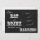 Cette invitation de réception après mariage présente un design de tableau noir et blanc avec les mots "Mangeons et buvons parce que nous sommes mariés !" sur le devant, ainsi qu'un espace pour "écrire" vos noms en biais sur le tableau, ainsi que la date de votre mariage. Au verso de l'invitation de réception après mariage figurent les noms d'avant le mariage de la mariée et du marié, ainsi que le lieu de leur mariage et les détails de la réception après mariage. Une façon moderne et amusante d'inviter vos invités à une réception après mariage.