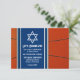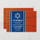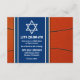 Carton d'invitation pour une réception de Bar Mitzvah sur le thème du basket-ball avec un fond de ballon orange et des accents de maillot de basket-ball bleu. Cette carte d'invitation pour une réception de Bar Mitzvah sur le thème du basket-ball est élégante et moderne. Cette carte d'invitation de Bar Mitzvah sur le thème du basket-ball présente un fond de ballon orange avec une étoile de David juive et des accents bleus. Les couleurs de ce design de Bar Mitzvah sur le thème du basket-ball sont orange, bleu, blanc et noir.