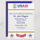 Cette invitation bleue et or est décorée du logo de l'Agence des Etats-Unis pour le Développement International (USAID). Le dos est décoré du logo de l'USAID et du mot "Retraité".