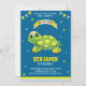 Invitation vos invités avec cette mignonne invitation de fête d'anniversaire avec une adorable petite tortue aux éléments vibrants contre un arrière - plan bleu. Ajoutez simplement les détails de votre événement sur cet modèle facile à utiliser pour en faire une invitation unique. Retourner la carte pour révéler un motif à rayures vert et blanc au dos de la carte.