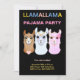 Carte d'invitation pour une soirée pyjama lama. Célébrez un anniversaire ou simplement une soirée pyjama. Trois mignons lamas sur fond noir. Motif d'étoiles multicolores au verso. Le texte est prêt à être personnalisé. Le mot lama signifie plusieurs choses. Lama en espagnol signifie appel et flamme (sacré). Lorsqu'on le lit à l'envers, c'est Am All. Les lamas sont connus pour leur gentillesse, leur unité et leur compassion. Profitez de votre soirée pyjama !!