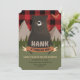 Invitation à l'anniversaire du bûcheron. Avez-vous un petit bébé en train de tourner le sauvage ? Cette invitation présente un arrière - plan de plaid de buffle rouge avec un paysage boisé et une illustration d'ours mignon. Customisez tout le texte avec vos informations de fête.