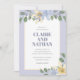 Le design présente d'élégants éléments de couleur aquarelle fleurie dans différentes nuances de violets poussiéreux, de bleus et d'or. Le design présente également différents types de verdure et des branches en vert et violet. Le côté arrière de cette simple invitation élégante est une teinte plus profonde de violet.