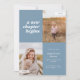 This graduation announcement feedback the words "a new chapter begins" on the top left of the card on a dusty blue background. It has spaces for two vertical photographito celebrate your graduate's journey si far, a photo from the past and a photo from the present. Le Front of the card has space for the graduate's name, class year, school, and future plan. The back of the card has space for additional text and can be used as a graduation party or to write a personnel message.