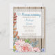 Une charmante invitation à la maison rustique avec un joli bouquet fleuri sur un arrière - plan en bois avec cadre en dentelle blanche.